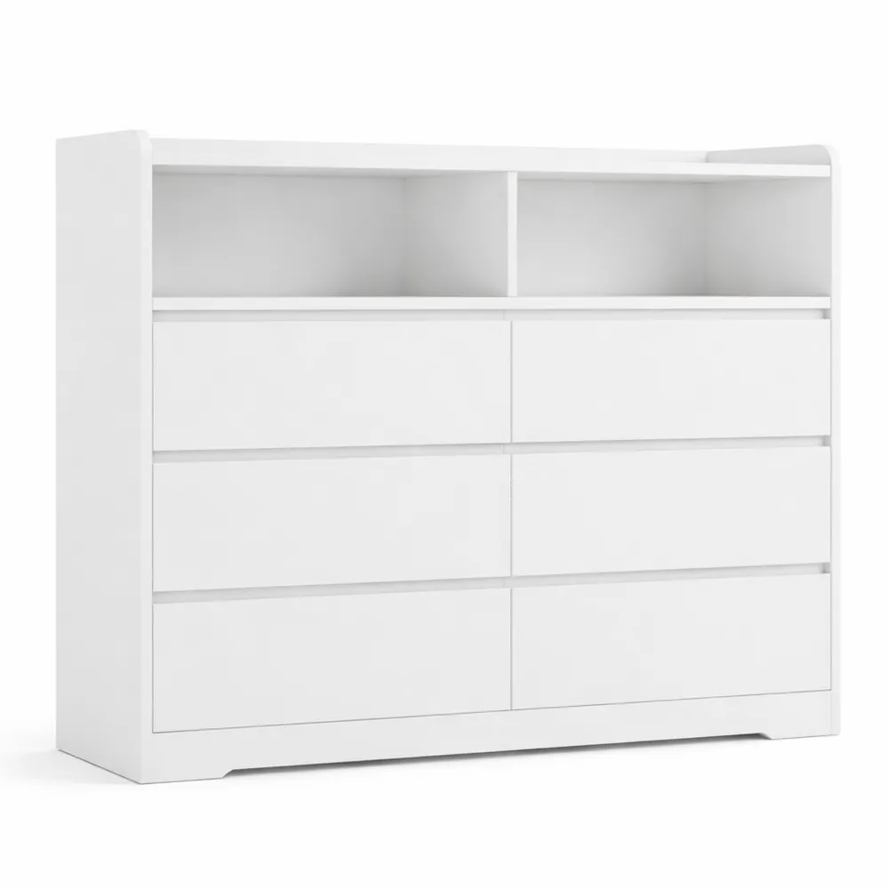 Ampio spazio di archiviazione: Con dimensioni di 120 x 40 x 100 cm, questa cassettiera offre spazio per organizzare libri, vestiti e giocattoli. Il piano d'appoggio può contenere vasi, cornici e cosmetici, mentre gli scomparti aperti sono adatti per esporre oggetti decorativi. Materiali: Realizzata in legno ingegnerizzato, la superficie ha una finitura impermeabile. Le guide in metallo e le piastre di supporto garantiscono stabilità. Il design senza maniglie è facile da usare. Dettagli: I bordi rialzati impediscono la caduta degli oggetti e gli angoli arrotondati aumentano la sicurezza. Design: Questo mobile combina cassetti chiusi e scomparti aperti, adatto a qualsiasi stile di arredamento e utilizzabile in camera da letto, soggiorno o ingresso.