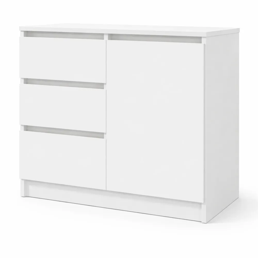 [Spazio portaoggetti:] L'armadietto include un'anta e tre cassetti per organizzare gli oggetti. L'anta offre uno spazio chiuso per protezione, mentre i cassetti facilitano l'accesso a vari articoli. Un ripiano interno aiuta a classificare gli oggetti, migliorando l'organizzazione.