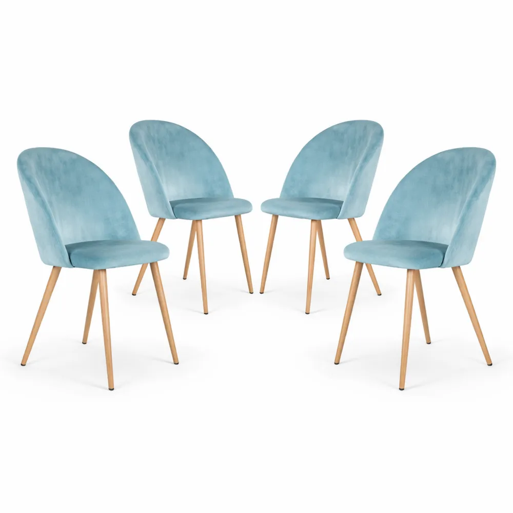 Queste sedie presentano un tessuto in velluto utilizzato sulla superficie, che offre una sensazione piacevole al tatto. Le gambe sono realizzate in metallo con un rivestimento che imita l'aspetto del legno, risultando resistenti e visivamente compatibili con la seduta. Sono dotate di piedini regolabili per proteggere il pavimento e adattarsi a diverse superfici. Misurano 47 x 47 x 78 cm con una capacità di sostegno fino a 120 kg. Sono adatte a vari ambienti come soggiorno, cucina, ristorante o ufficio. Sono disponibili in diversi colori, come rosa, blu, verde, nero, grigio e marrone.