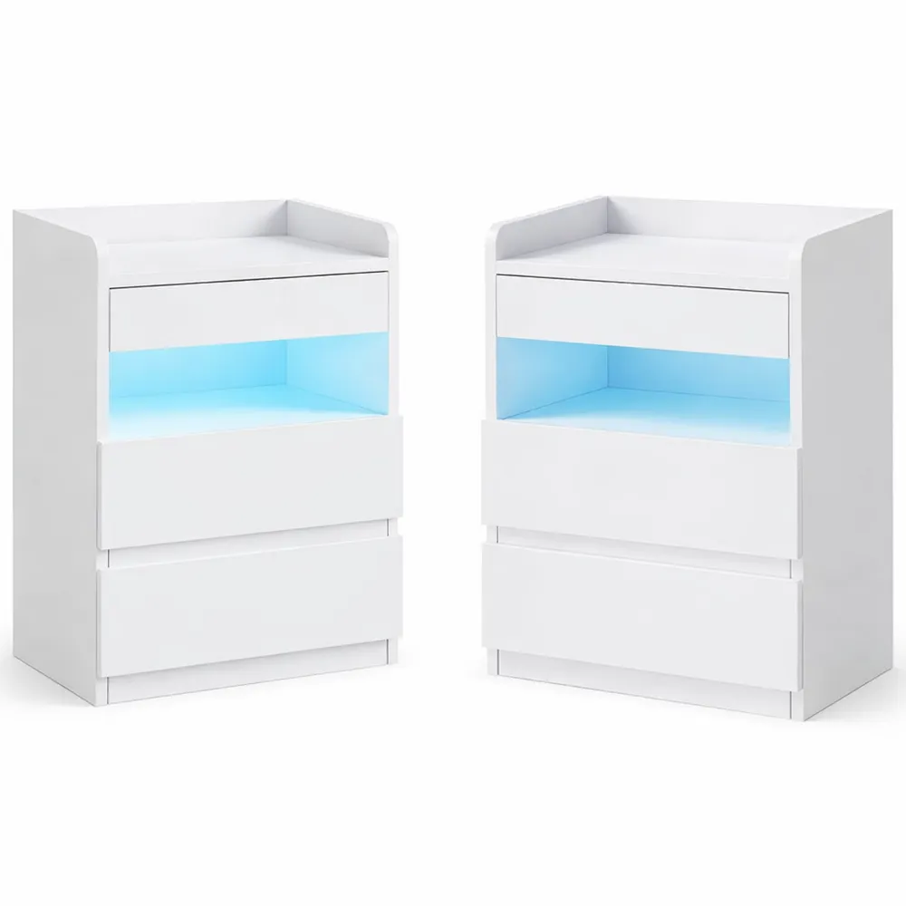 Comodino dotato di funzione di ricarica con presa elettrica e porta USB, permette di caricare comodamente dispositivi come telefoni e lampade da comodino. Presenta una striscia luminosa LED integrata con diverse modalità e colori regolabili tramite telecomando. Offre ampio spazio di archiviazione, con due cassetti spaziosi e un vano aperto. Il design minimalista senza maniglie si adatta ad ambienti moderni e classici. Realizzato con materiali robusti, garantisce stabilità. Comprende scomparti separati e sicuri per oggetti personali, con un interno capiente per libri e accessori necessari. Guide di scorrimento di qualità facilitano il movimento dei cassetti. La protezione con bordo rialzato sul piano del tavolo contribuisce alla sicurezza degli oggetti durante l'uso.