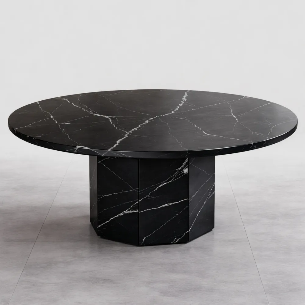 Tavolo da pranzo rotondo per 4-6 persone in finto marmo nero con base ottagonale