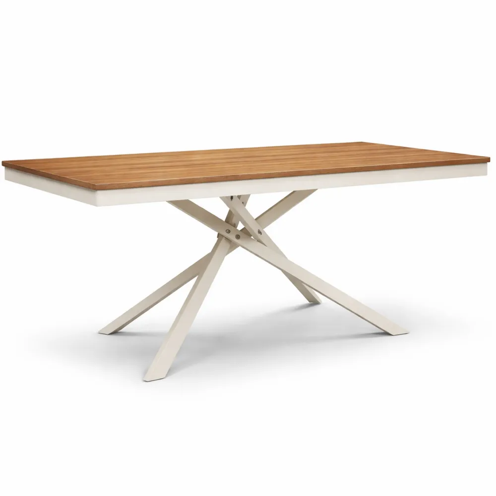 Tavolo dotato di gambe in metallo oblique e incrociate. Grazie al meccanismo di apertura, consente di aggiungere una allunga laterale da 50 cm, estendibile per ospitare fino a 8 persone.